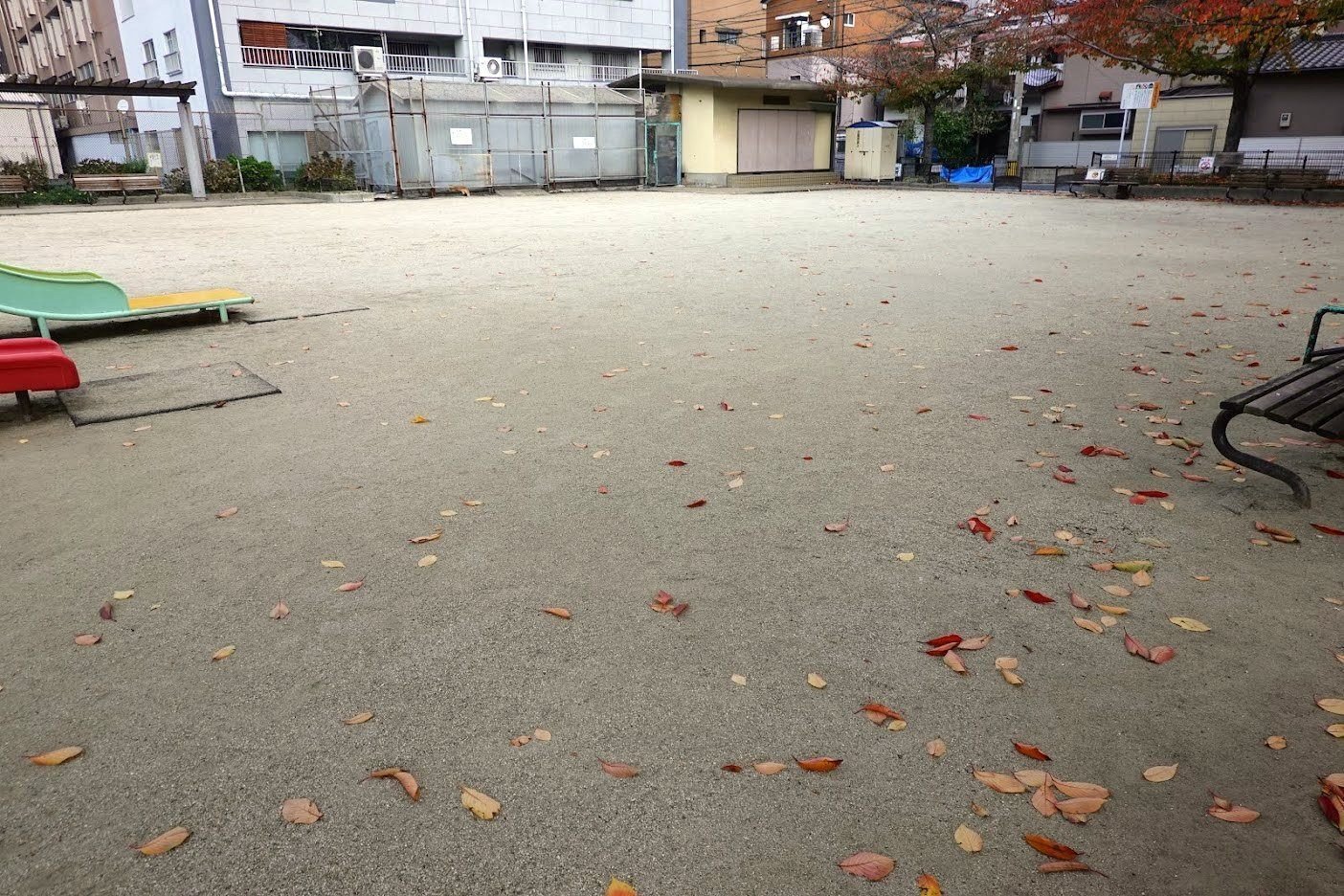 くだんのハトの縄張り内にあるが、ほとんど寄りつかないのが、下の写真で示す公園(片野西公園)だ。草地に乏しく、ハトの餌が見るからに少ない。花壇や生垣もあるとはいえ、高木のサクラと低木のアジサイ、それにヒガンバナが中心で、餌を常に供給してくれる草木はあまりない。