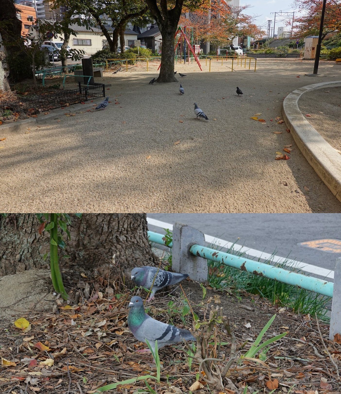 少し離れた富士見公園には逆にハトがたくさん集まってきている。遊具と広場という構成は片野西公園と同じながら、花壇の面積が広く、地面が柔らかい。サクラがほとんどだった片野西公園に比べ木の種類が豊富なのも、多くの餌をもたらしてくれそうだ。ハトとスズメが仲良くついばんでいる姿をよく見かける。