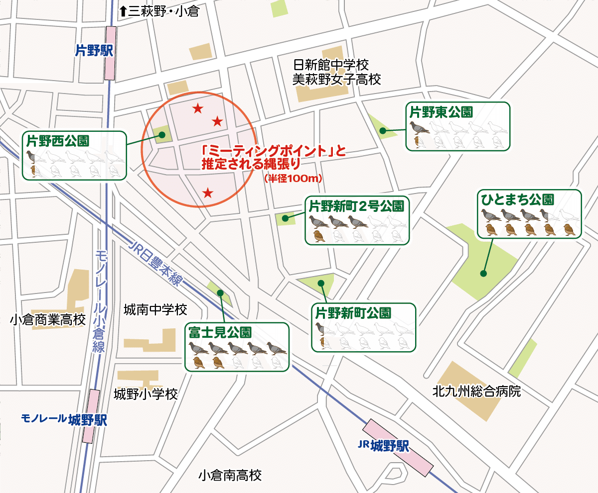 もっともハトとスズメが共存関係にあるからといって、公園に集まってくる羽数の比率は1:1ではない(地図のアイコンを参照)。富士見公園は圧倒的にハトが多く、ひとまち公園はスズメのほうが勝る。食べているものの微妙な違いがあるのかもしれないし、スズメとしては保護色でもある茶色の草木が多いほうが集まりやすいのだろう(?)。
