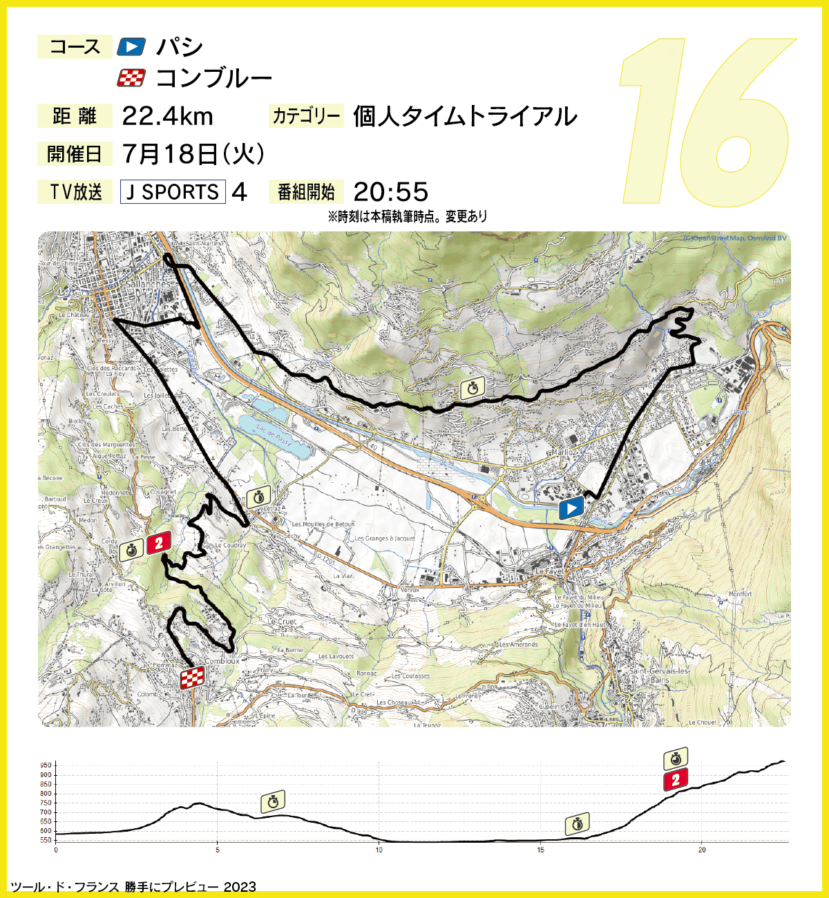 レースは序盤から緩く登り、残り15.7km地点(スタートから6.5km地点)に第1計測地点、下りと平坦のセクターを経て残り6.2km地点(スタートから16km)で第2計測地点を迎える。ここからが登りとなり、連続して10パーセントの勾配区間が現れる登坂に取り掛かる。残り3.7km地点(スタートから18.5km)地点に第3計測地点が設けられ、ここからゴールまではやや登坂は穏やかになるが、引き続き上り基調でフィニッシュに至る。