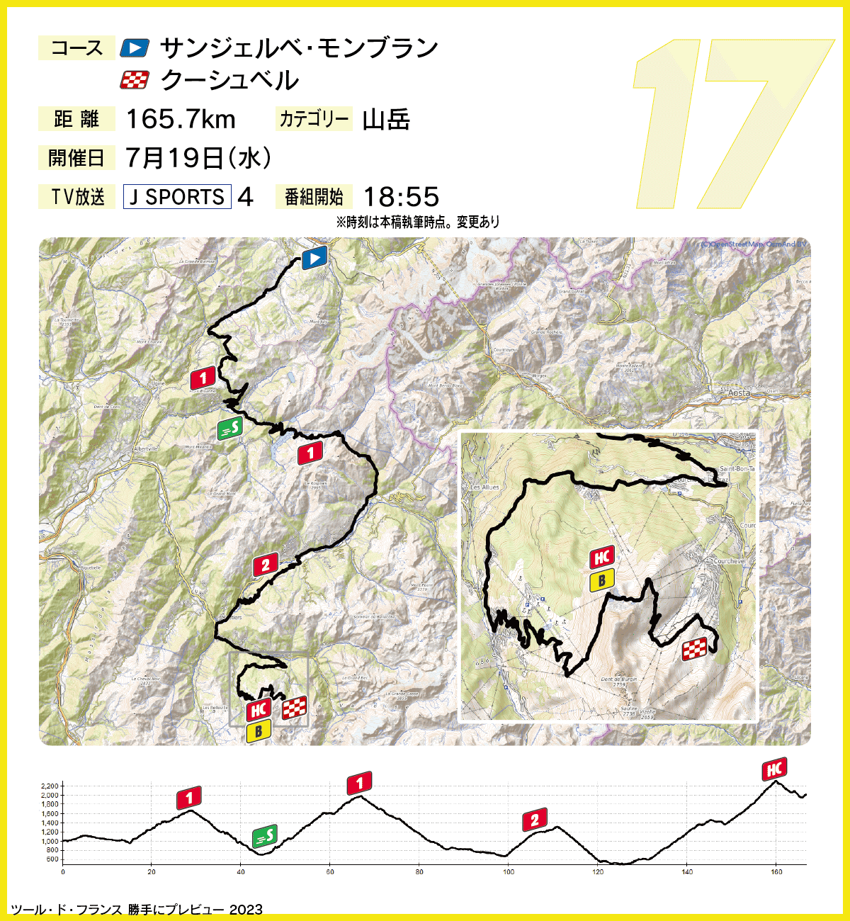第17ステージは最難関にふさわしく1級山岳セジー峠、1級山岳ロゼラン、2級山岳ロンジュフォアとアップダウンを繰り返し、超級山岳スデ峠に取り付く。スデ峠は残り6.6km地点にあり、少し下ったあと再び短い激坂を登ってゴールラインに至る。最初に大きな逃げ集団が発生して徐々にふるい落とされ、スデ峠で逃げ切り勝利を狙う者たち、総合表彰台を狙う者たちなど思惑の異なるライダーが渾然一体となって頂上を目指すだろう。