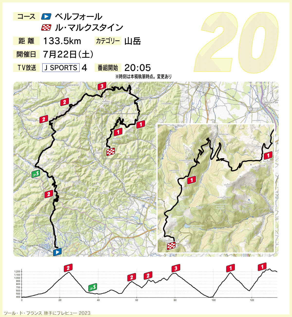 133.5kmという短いステージの中に、カテゴリーが付いた登坂だけでも6カ所が入っている。2級山岳バロン・ド・アルザス(残り109.5km)、2級山岳クロワ・ドゥ・モイナ峠(残り77km)、2級山岳グロス・ピエール峠(残り68.6km)、3級山岳シュルシュト峠(残り54.1km)、1級山岳プチ・バロン(残り25.3km)、1級山岳プラッツァーバーゼル峠(残り8.2km)という順だ。