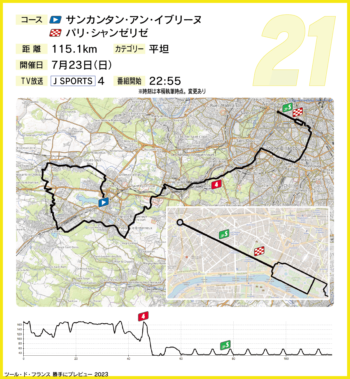もっとも平坦基調には違いなく、集団スプリントで最後の区間優勝者が決まる。リタイアせずに残っているスプリンターにとって、シャンゼリゼでの勝利は格別。石畳の路面ゆえに重量級のスプリンターに有利ながら、テクニカルなカーブの先という特徴は軽量級のスプリンターやパンチャーにも可能性を残しており、エーススプリンターの全てが横並びでゴールに入ってくるだろう。
